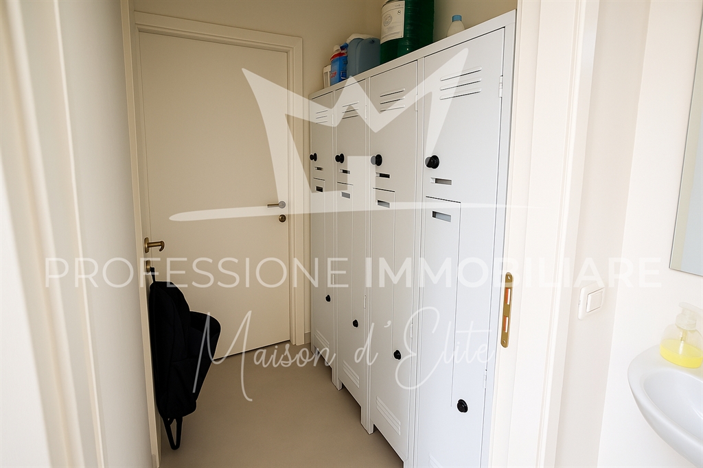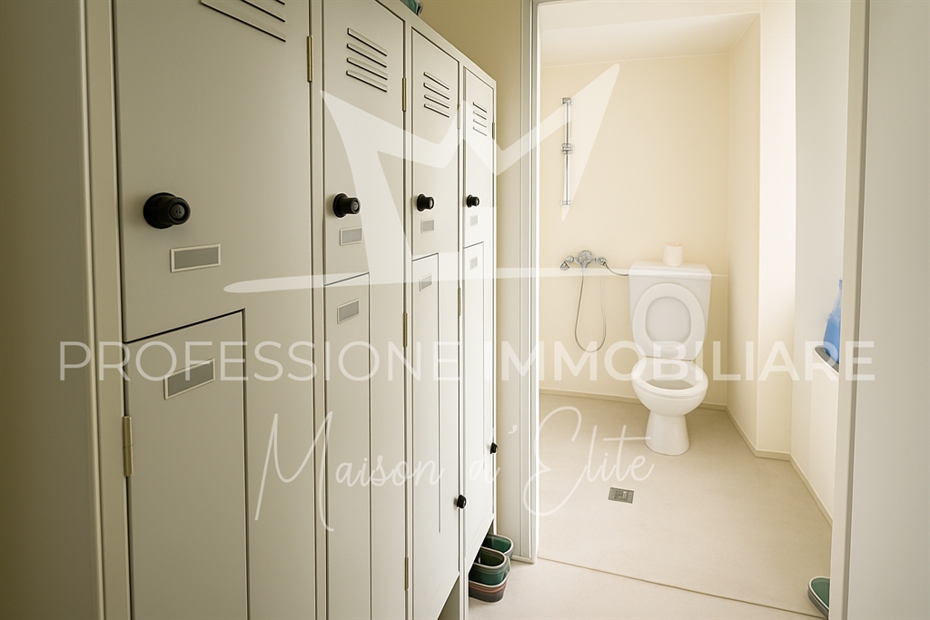 Zona dispensa e servizio igienico con antibagno, oltre a spogliatoio.